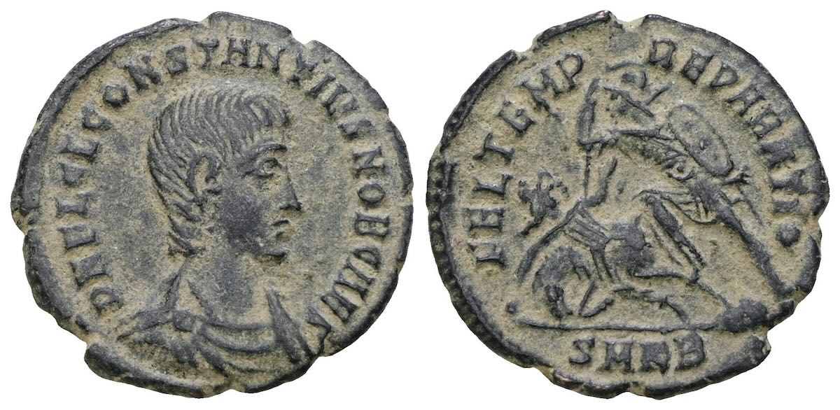 Gallus or Constantius II? Coins of both Gallus and Constantius II have legend including CONSTANTIVS. Some coins attributed by sellers to Gallus are actually of Constantius II. All ten types distinguish Constantius II and Gallus in two ways. The first is that Constantius II minted these types as Augustus with legend ending PF AVG and Gallus minted as Caesar with legend terminating NOB CAES or NOB C (Gallus was never Augustus). The other is that Gallus was always depicted bare-headed while Constantius II has a diadem.