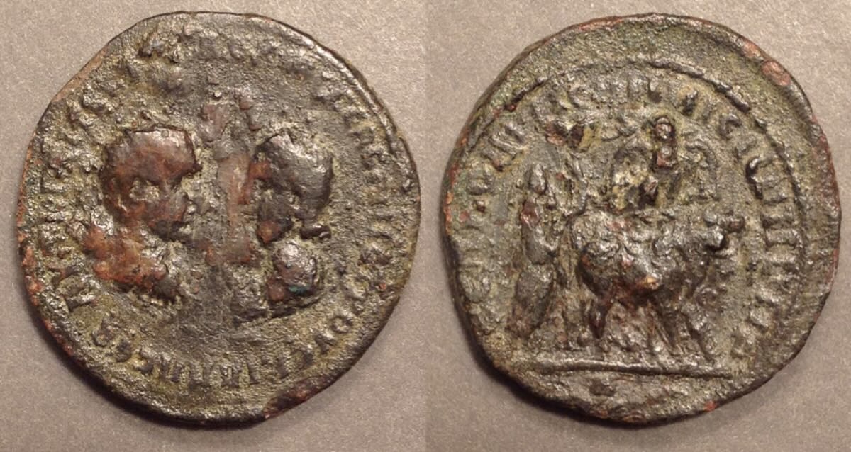 Carrhae (a.k.a. Harran): Carrhae issued coins from Marcus Aurelius to Gordian III. It was lost to Shapur I c. 230 and recovered for Rome by Gordian III from Shapur I at the Battle of Rheseana in 243 [wikipedia], which also recovered Nisibis, and Singara. Most coins of Carrhae are very poorly produced. Tetradrachms of Syrian fabric are attributed to Carrhae for Caracalla, Macrinus, and Diadumenian. It has no coins of Maximinus (235-238).