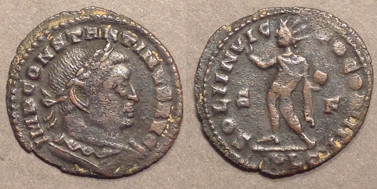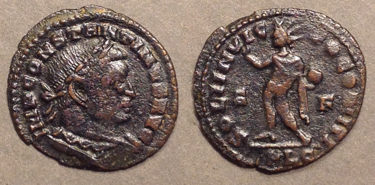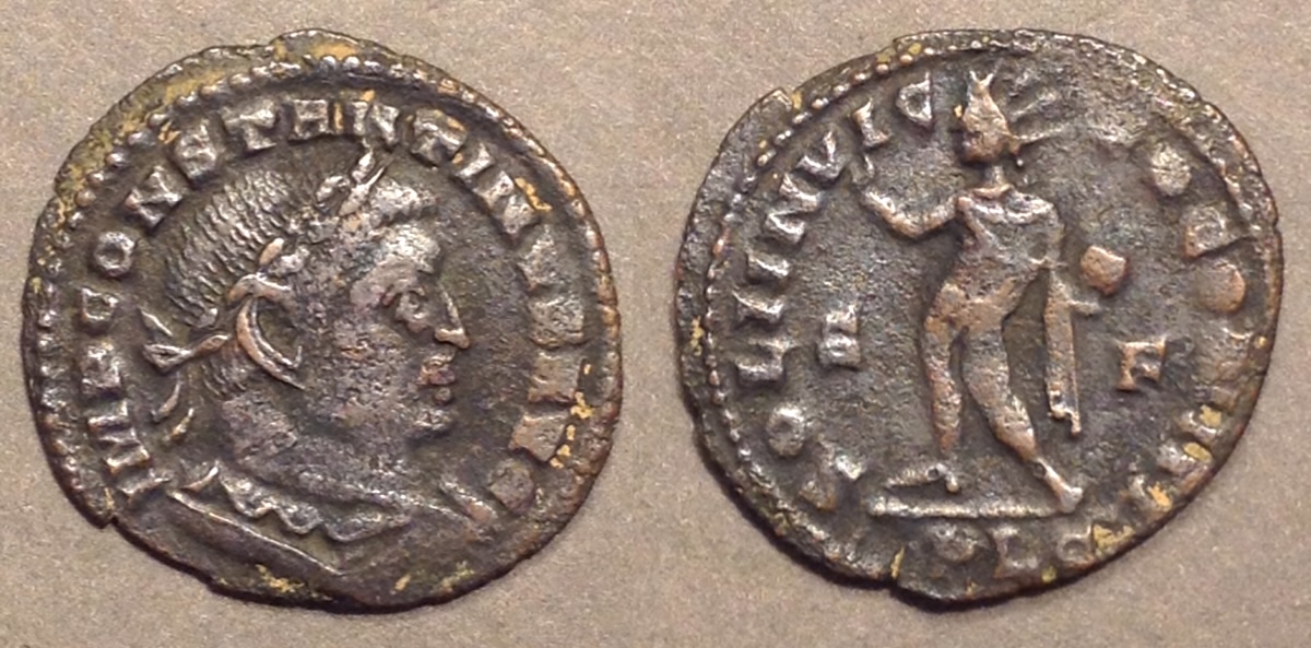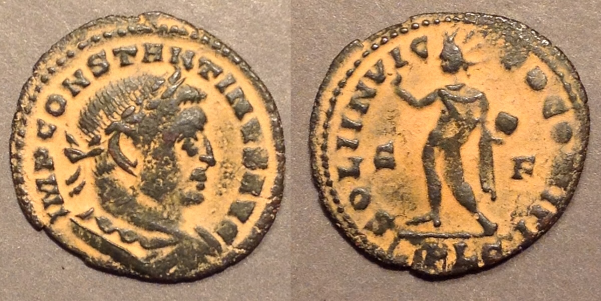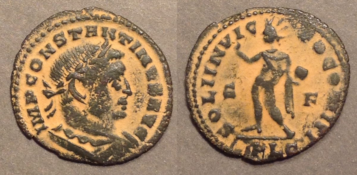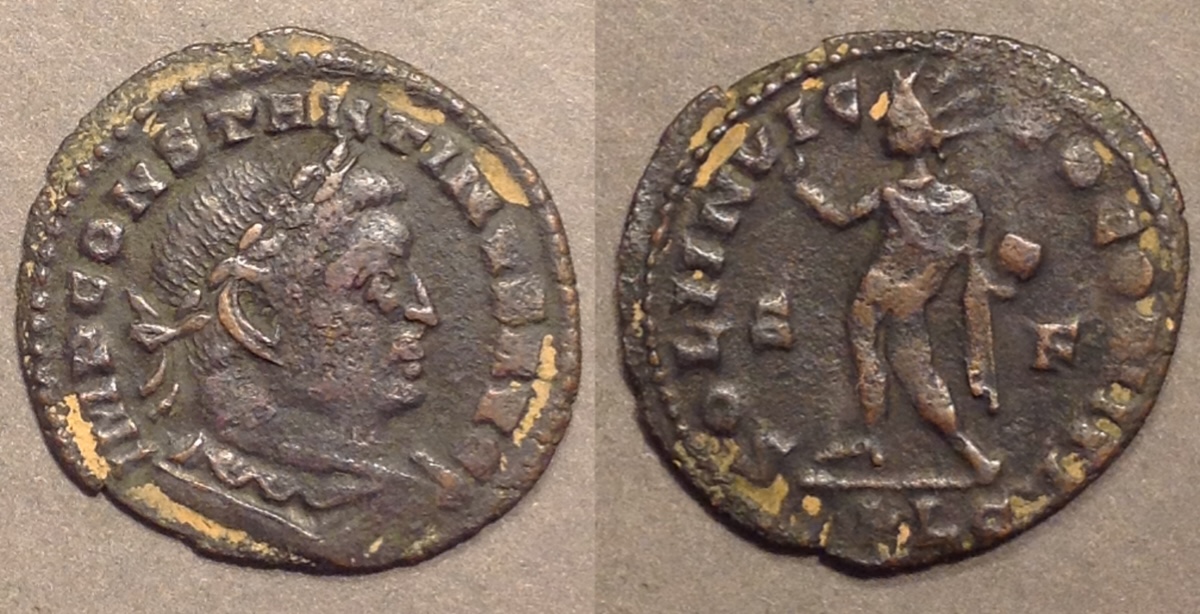 I took a common and inexpensive type of Constantine which had been repatinated with the common yellow/orange applied cover. (A follis of Galerius is a second exaample below).