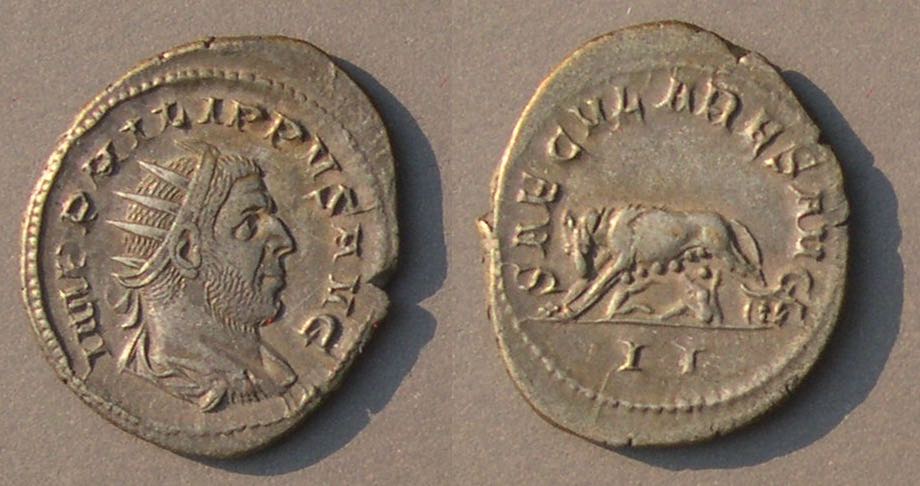 Sometimes the coins do not indicate the officina number explicitly. For example, we know that under under Severus Alexander, 222-235 AD, the mint had six officinae but the coins do not show officinae marks. However, at other times, the officinae are clearly distinguished by marks on the coin. For example, under Philip his well-known series of animal types for the Saecular games of 248 AD (commeorating the 1000th anniversary of Rome's founding) has six officinae clearly numbered I, II (with the wolf-and-twins, to the right), III, IIII, V, and VI in the exergue (the numerals are prominent below the line on which the animals stand).