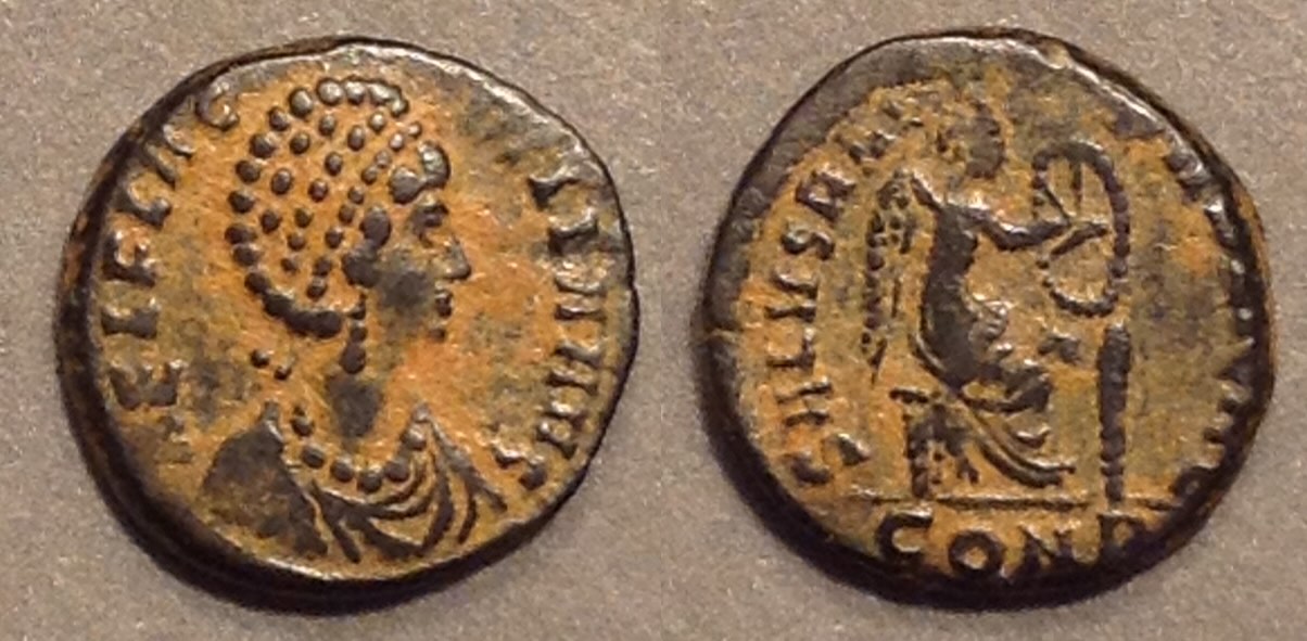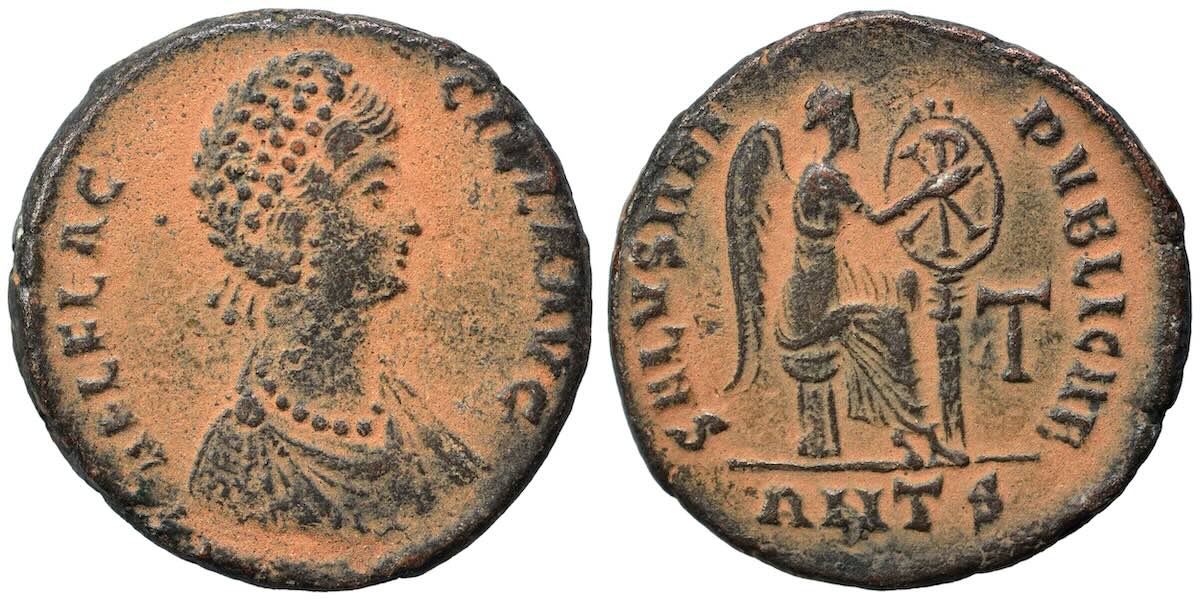 Later issues differ from earlier issues by the addition of a "T" in field right alongside the column (below). The issues in RIC are labeled "378-388" but the text shows that her coins were issued between the elevation of her son Arcadius Jan. 19, 383 and her death c. 386.