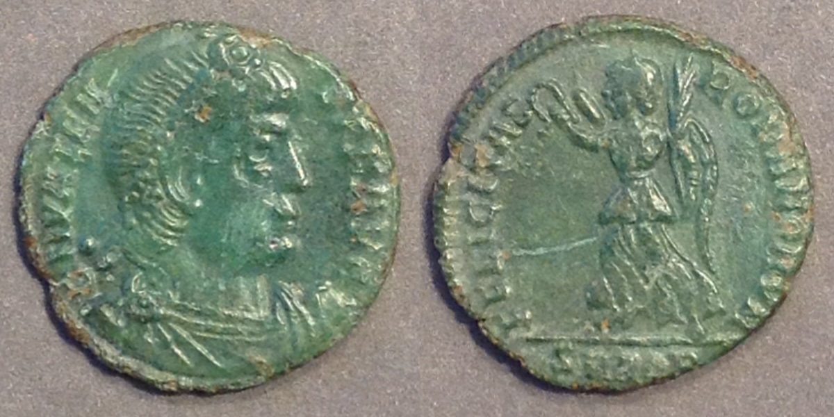 RIC is unclear whether the single example they found with "DN VALENTINIANVS PF AVG" legend is of the first or second Valentinian. It is listed under a time period of the second, but with a special legend more appropriate for the first. It is "R5" and without a photo. The arrangement is not certain. The next photo of an example looks like Valentinian I.