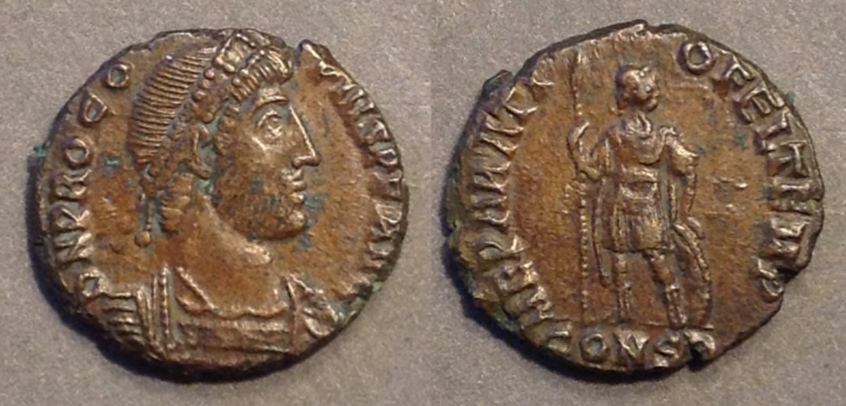 Type 7 and Type 8 are the only regular types of Procopius. Type 8 with bust right is much rarer than Type 7 with bust left. Neither is as rare as they used to be. Many are coming out of the Balkans and they are now only "scarce," no longer rare. Type 7 can be found (rarely) with full flan in high grade, but Type 8 can not. It regularly suffers from chipped flans (brittle metal?) and crowded types.