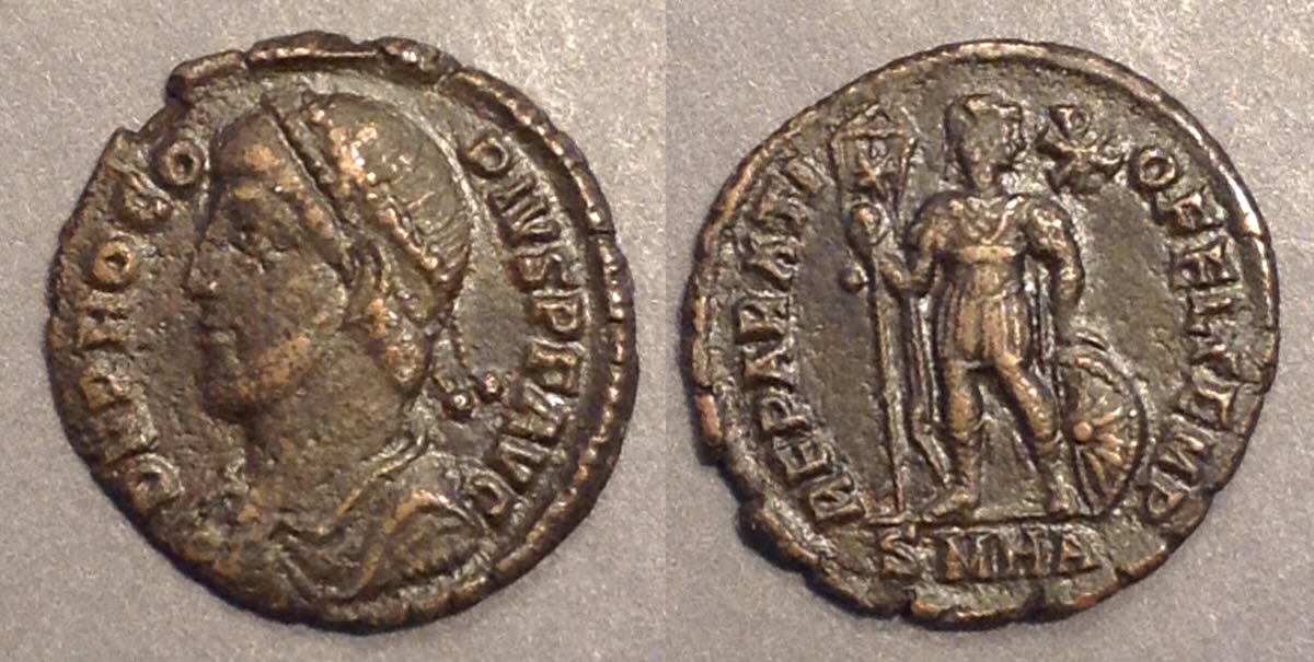 Confer RIC (Con) 4, page 210, for this reverse type in gold, but with spear instead of the standard, plate XI.6.