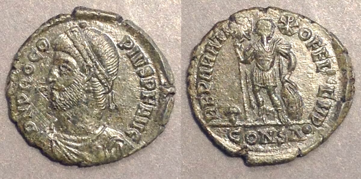 RIC lists AE2 and AE1 extremely rare types of Procopius with this legend (Table 1A).