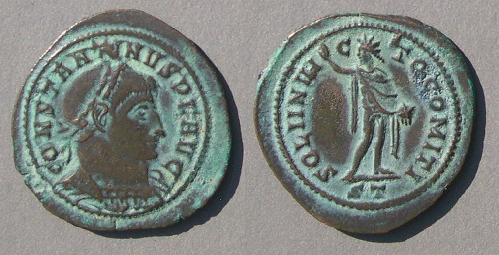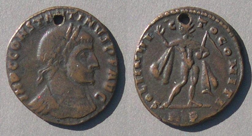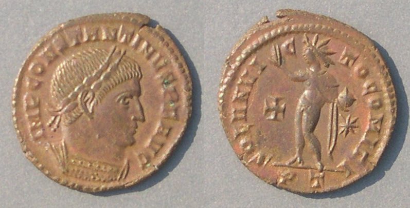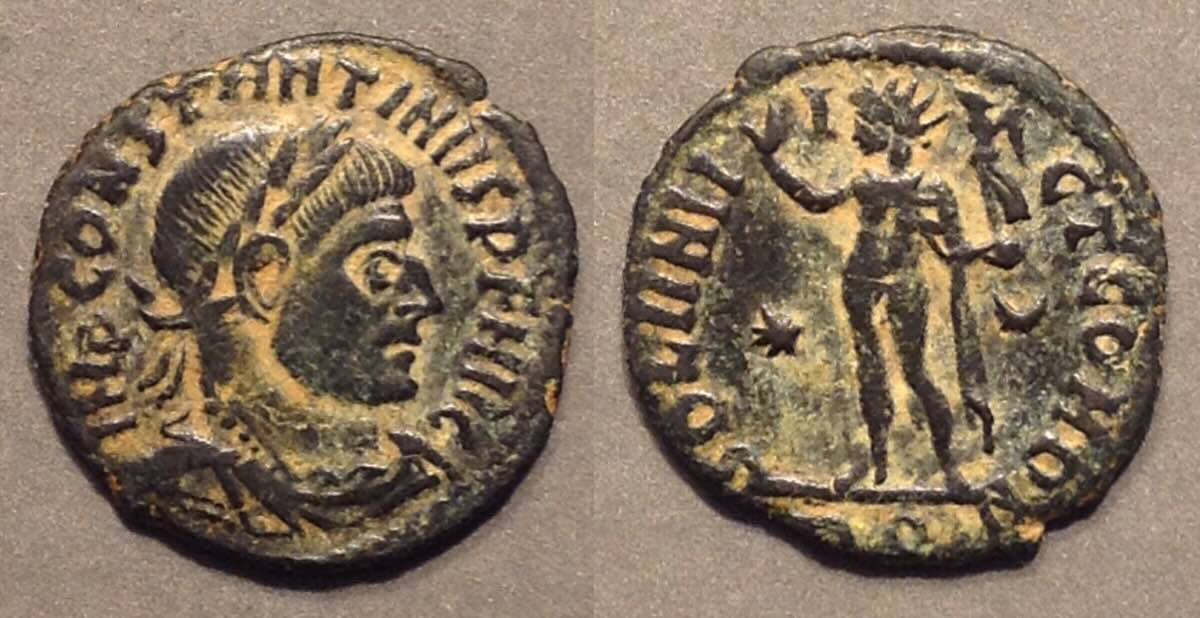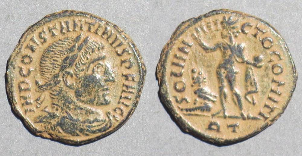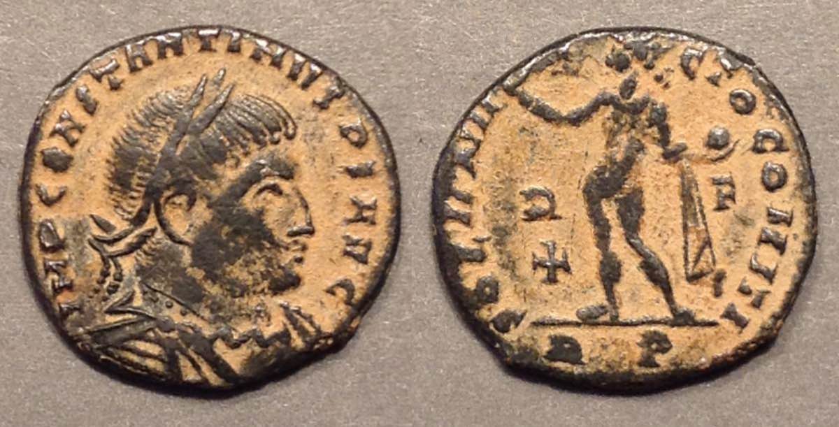 The square cross in the left field is a control mark, but, because of its Christian connection and the fact Constantine was the first Christian emperor, the cross is so important that it makes a very significant variety. It is worth five or ten times as much as the type without the cross. It is the first Roman AE type (variety?) with a Christian connection.