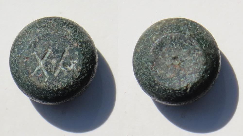 A Byzantine weight marked "one ounce". The X-like symbol is for ounce and "A" is "one" in Greek.