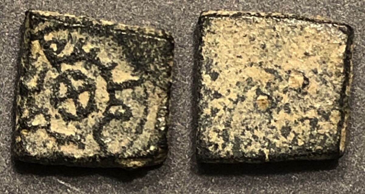At the upper right is a half-dirham weight (3 dots and rectangular) 9 mm on a side and 1.43 grams (#1116). The second weight is a half-dinar weight (3 dots and circular, 11 mm diameter and 2.05 grams( #1146). A US cent is much larger at 19 mm in diameter (see the red image below).