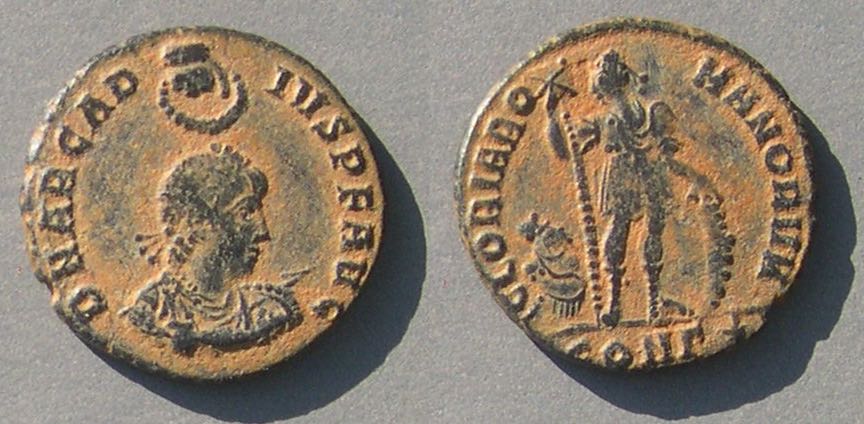 Chi-rho on the shield.A type very similar to that of Magnentius (the first coin on this page) was issued in the name of Constantius II at Trier in the last months of the reign of Magnentius: